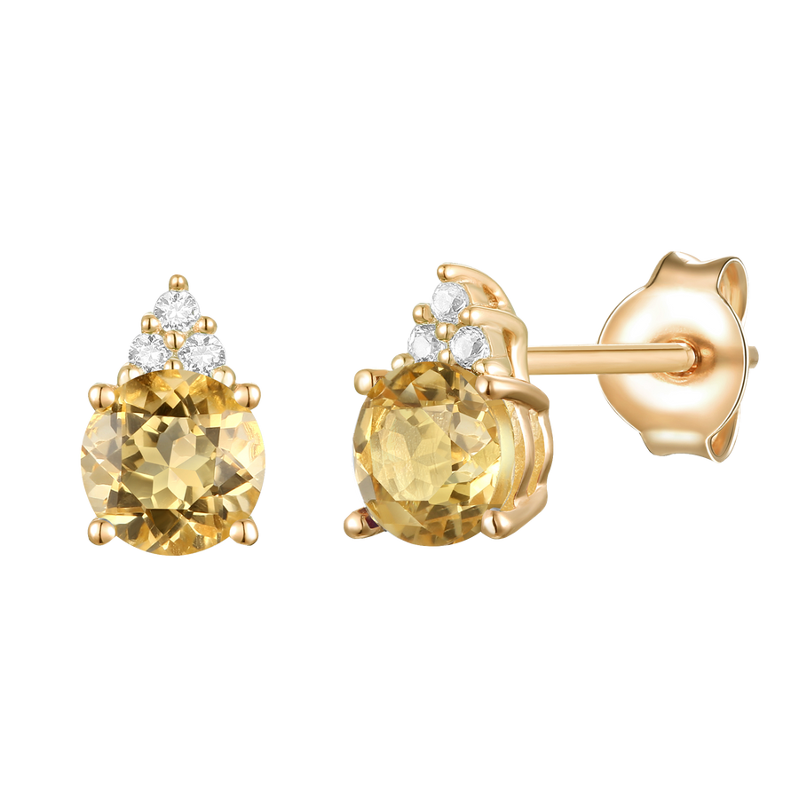 Elegant 14K Gold Stud Earrings with Diamonds and Citrine – 4.5mm Stone