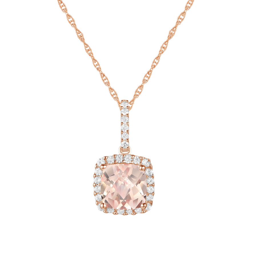 This stunning pendant features a cushion-cut morganite, set in 14K rose gold, surrounded by sparkling diamonds. Its soft, romantic pink hue and the warmth of rose gold make it a perfect symbol of love and elegance
