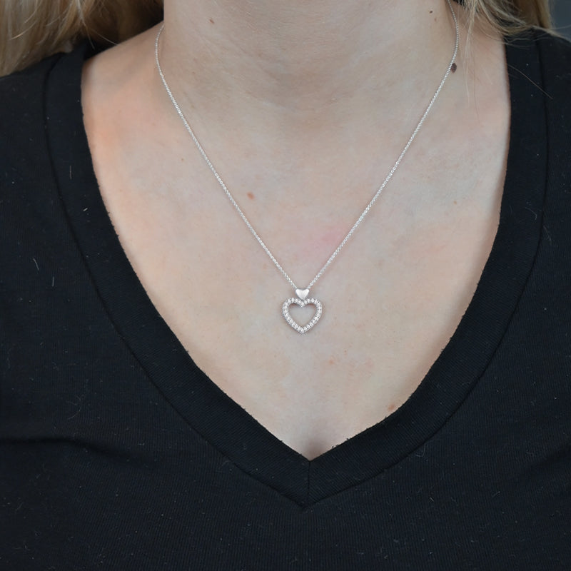 Beautifully crafted in sterling silver, this open heart necklace showcases the brilliance of lab-grown diamonds, totaling 1/5 carat. With diamonds of F-G color and VS1-VS2 clarity, it represents a pure and eternal love, making it a perfect symbol of connection and devotion for someone close to your heart